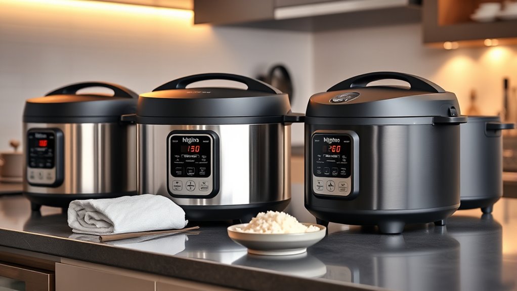 Have you ever wondered if investing in a luxury rice cooker is worth the extra cost? The truth is, these models typically range from $100 to over $300, reflecting their advanced features and premium materials. When evaluating value, consider the variety of cooking functions like multi-grain, GABA rice, and slow cooking—these add versatility that justifies higher prices. Durability matters too; stainless steel components and durable non-stick coatings mean long-term savings and better performance. Features like fuzzy logic, induction heating, and pressure cooking produce restaurant-quality rice, offering significant value for discerning users. Ultimately, comparing price-to-performance ratios helps ensure you get a model that delivers consistent results, energy efficiency, and convenience—making the investment worthwhile for elevating your kitchen experience.