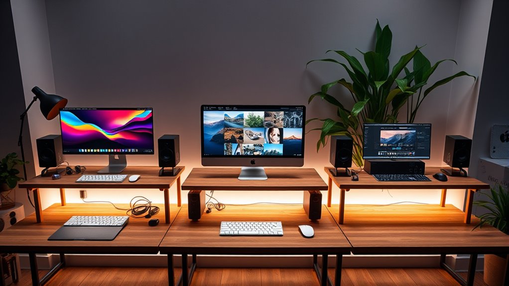 If you’re looking to power up your creative projects in 2025, I recommend the Mac Mini configurations featuring the M4 Pro chip for its 12-core CPU and 16-core GPU, which is perfect for demanding tasks. The M4 chip with a 10-core CPU is also a great option for high-performance needs. You’ll want ample RAM, up to 64GB, and SSD storage for efficient workflows. Stick around to find out how to choose the best setup for your needs.