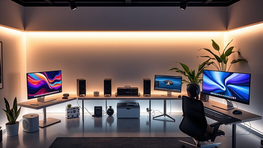 Choosing the right memory and storage options for your Mac Studio is essential if you want to guarantee peak performance for your creative projects. If you’re tackling demanding applications like video editing or 3D rendering, consider upgrading to 48GB or 64GB of unified memory. This boosts multitasking and enhances performance markedly. When it comes to storage, options range from 512GB to an impressive 8TB SSD, which affects both data capacity and speed. Upgrading at purchase helps ensure your configuration meets your long-term needs, avoiding frustrating future upgrades. Remember, the chosen memory and storage directly influence your overall costs and how efficiently you manage large files, ultimately impacting your workflow’s responsiveness and productivity.