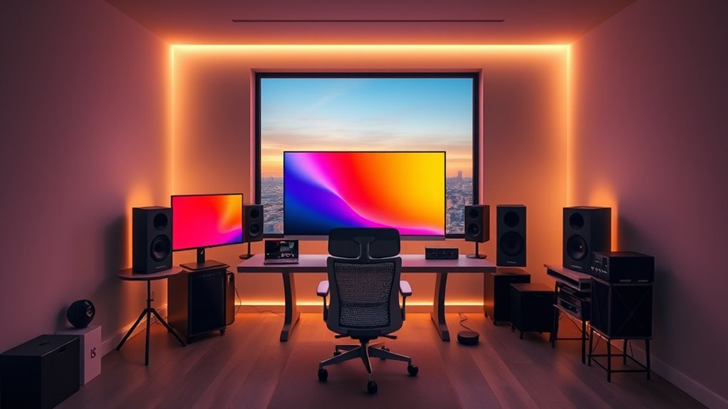 After ensuring I have the right connectivity options, I turn my attention to display support, which plays an essential role in my video editing setup. I always check the maximum number of external displays supported, aiming for resolutions like 6K or even 8K to enhance my workflow. Compatibility with Thunderbolt 4, HDMI, and DisplayPort is critical for connecting multiple high-resolution monitors simultaneously. I evaluate the GPU capabilities, considering GPU cores and hardware-accelerated decoding, as they impact handling multiple screens smoothly. Supporting high dynamic range (HDR) content and high refresh rates is indispensable for accurate color grading. Finally, I confirm the system’s ability to maintain performance during intensive tasks with a multi-monitor setup, ensuring my editing experience is seamless.