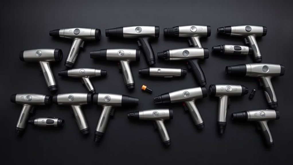 With multiple speed settings, massage guns give you the flexibility to target muscles precisely and adjust intensity to your comfort level. Some models offer as few as three speeds, while others have up to 30, providing a wide range for different needs. Higher speeds, often over 3000 RPM, are perfect for deep tissue massage and intense relief, helping muscles relax deeply. Lower speeds, under 1500 RPM, are better for sensitive areas, warm-up, or gentle relaxation. The ability to customize speed allows me to gradually increase intensity, guaranteeing a tailored massage experience. Digital or LED controls make switching between settings quick and easy, enhancing usability during a session. Choosing a device with versatile speed options ensures I can personalize my recovery and comfort effectively.