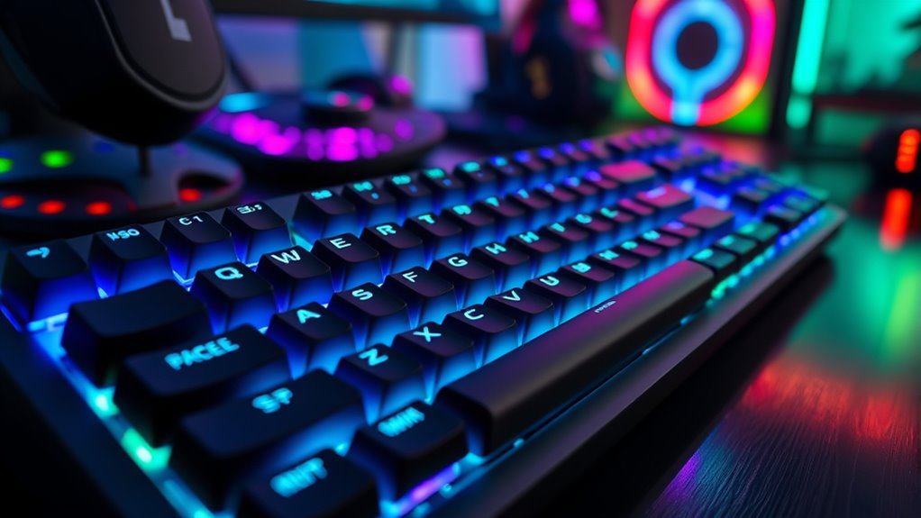 Customizable keys and macros are like secret weapons in my gaming arsenal. They can turn complex commands into single keystrokes, giving me a speed edge and freeing my mind for strategic thinking. For competitive play, they’re essential—they boost efficiency and reaction time. If you want to elevate your game, investing in keyboards with these features is like revealing hidden powers, making you faster and more versatile on the battlefield.