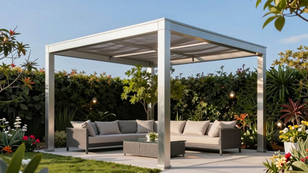 Selecting a metal pergola with a canopy that matches your outdoor style is essential for creating a cohesive and inviting space. I recommend choosing a pergola with colors and designs that complement your existing décor and architecture, whether modern, rustic, or traditional. Pay attention to the finish of the frame—powder-coated or painted surfaces should harmonize with nearby structures. Matching the canopy’s color and pattern to your outdoor furniture or garden themes helps tie the look together. If you want flexibility, opt for customizable or retractable canopies to adapt to different occasions and seasons. Finally, guarantee the overall design, including the roof and support elements, aligns with your aesthetic preferences, making your outdoor area feel seamless and well-coordinated.