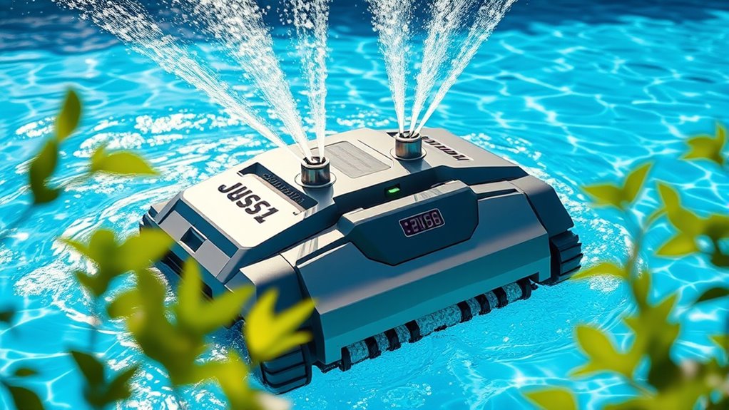 When selecting a powerful pressure pool cleaner, durability and build quality are critical factors that guarantee long-lasting performance. High-quality cleaners use durable plastics and corrosion-resistant materials to withstand constant exposure to chlorinated water and pool chemicals. Reinforced wheel axles, heavy-duty drive belts, and robust internal components further enhance longevity. Well-designed pressure-side cleaners feature sealed gear systems and corrosion-proof housings, preventing wear and damage over time. The overall construction, including tight fittings and reinforced hoses, minimizes leaks, cracks, and part failures during extended use. Regular maintenance—like replacing debris bags and inspecting moving parts—also helps preserve the cleaner’s integrity. Prioritizing build quality ensures your pressure pool cleaner remains effective and reliable season after season, delivering consistent cleaning power.