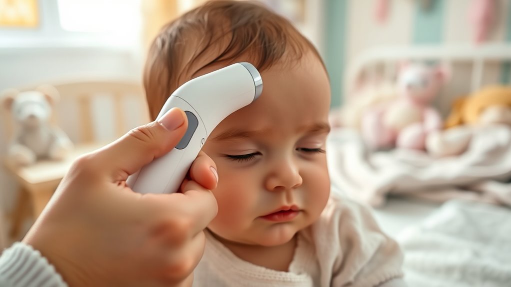 Ever wondered how often you should calibrate your thermometer? I recommend checking it at least once a month to guarantee accuracy. If it’s been dropped or exposed to extreme temperatures, calibrate it sooner. Regular calibration helps keep readings reliable, so you can trust your little one’s temperature and respond quickly if needed. Don’t forget, a well-maintained thermometer is key to keeping your baby safe and comfortable.