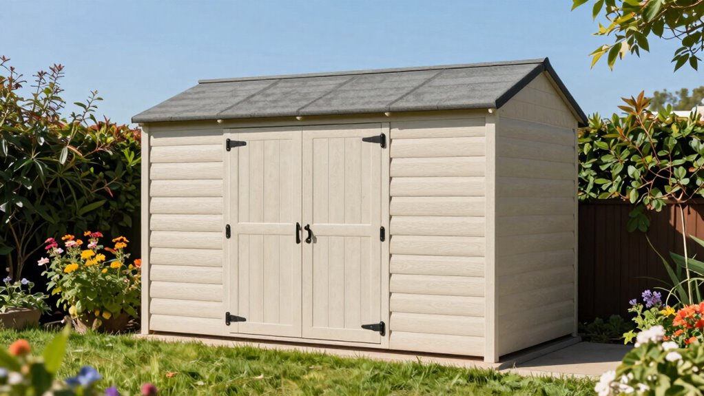 Choosing the right resin outdoor shed is like finding the perfect puzzle piece—once it fits, everything just clicks. With options ranging from compact cabinets to spacious sheds, you’re sure to find one that meets your needs and keeps your outdoor gear organized. Just remember to evaluate size, durability, and features. Trust me, investing in a quality shed now will make your outdoor space as tidy as a well-kept garden—beautiful and stress-free.