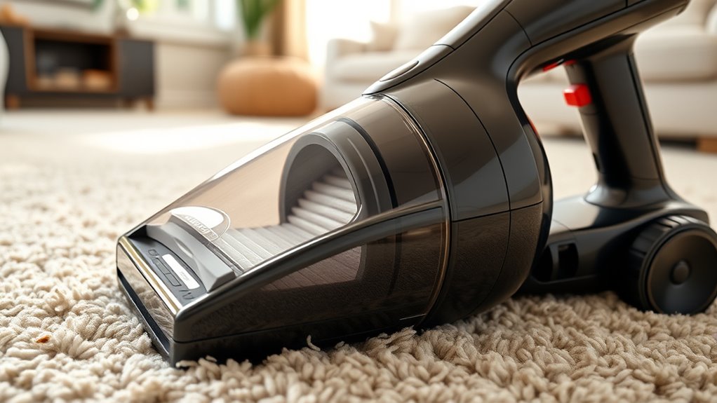 Maintaining a pet hair vacuum with a HEPA filter is simpler when the design prioritizes ease of access and straightforward maintenance features. Look for models with washable filters, which save money and facilitate upkeep, and check if filter compartments are easy to reach with clear instructions. A dustbin or dirt tank that empties easily, ideally with one-touch or hands-free mechanisms, makes cleanup less messy and more efficient. Tangle-free brush rolls and specialized pet hair tools help prevent clogs and reduce maintenance time. Simplified access to filter compartments ensures you can quickly replace or clean filters as needed, keeping the vacuum performing at its best. A well-designed vacuum minimizes hassle, so you can focus on keeping your home clean and allergen-free.