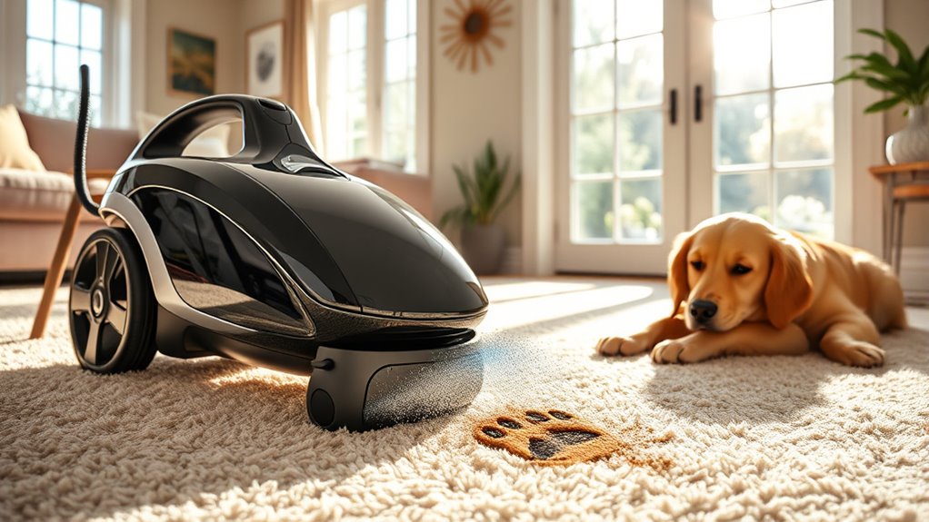Suction power is a crucial factor in choosing a portable carpet cleaner for pets because it directly impacts how effectively you can remove stubborn stains and embedded dirt. Higher suction, measured in Pascals (Pa), means you can tackle deep-seated pet messes more efficiently. I recommend looking for a model with at least 10,000 Pa to guarantee it handles tough stains without multiple passes. Strong suction also speeds up drying times by extracting more moisture during cleaning, which is a big plus. Plus, better suction reduces the effort needed, saving you time and energy. The motor’s design plays a big role here—upgraded motors can deliver up to 50% more power, giving you superior cleaning performance and making your pet cleaning routines much simpler.