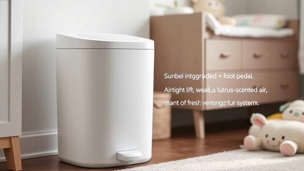 When it comes to designing a baby diaper pail, I look for styles that seamlessly blend with nursery decor while offering practical features. I prefer neutral colors and modern finishes that complement the room’s style without clashing. A compact, space-saving shape is essential for fitting into small corners or between furniture, maximizing space without sacrificing capacity. Features like a sliding or soft-close lid help reduce noise and airflow disruptions, boosting odor containment and overall user experience. Childproof locks and secure closures are must-haves to prevent curious toddlers from accessing dirty diapers. Additionally, I value smooth, non-porous surfaces and simple interface designs that make cleaning quick and easy, ensuring the pail remains hygienic and visually appealing in the nursery.