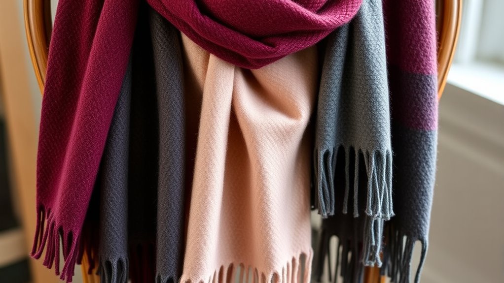 Choosing a cashmere scarf that offers versatility means selecting one that can effortlessly adapt to various styles and occasions. A larger size allows me to style it in multiple ways—knotted, looped, or draped—to match any look. Neutral colors like black, beige, or grey make pairing with different outfits seamless, whether casual or formal. I look for designs with finished edges and classic patterns or solid colors, so they enhance my wardrobe without clashing. Lightweight yet warm fabrics enable layered styling, making the scarf a statement piece or practical warmth provider. Multi-seasonal versatility is key—balancing softness, breathability, and insulation—so I can wear it comfortably across different climates and fashion needs. This adaptability makes a premium cashmere scarf truly worth the investment.