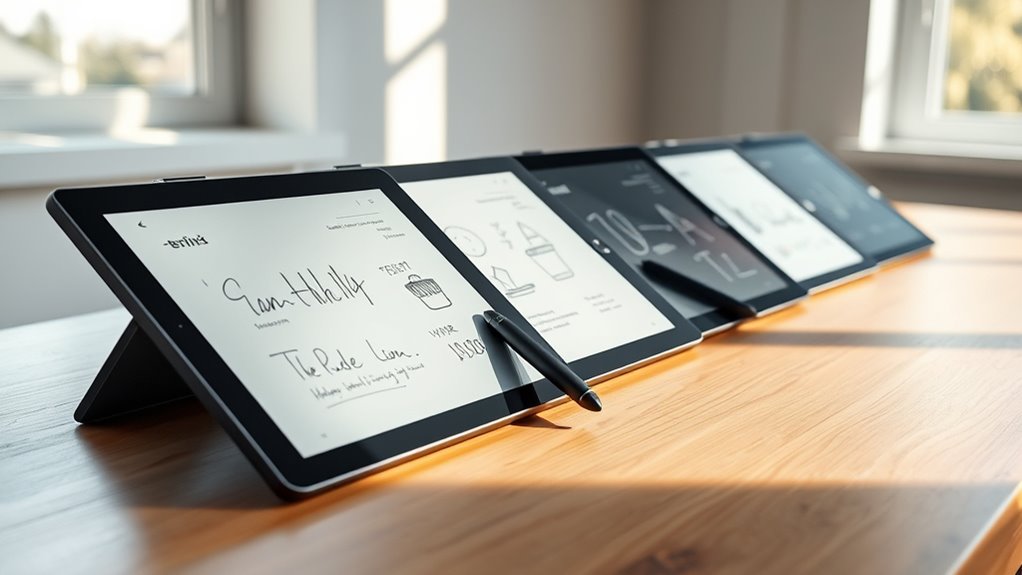 What makes a stylus truly enjoyable to use on an e-ink tablet? A high-quality stylus with 4096-level pressure sensitivity offers a natural, responsive feel that closely mimics traditional writing tools. Low latency and minimal lag are essential for smooth handwriting and quick note-taking, preventing frustration. Features like an eraser function and various pen tips boost versatility and precision, making digital annotations feel more intuitive. A textured, paper-like screen surface enhances grip and reduces fatigue during long sessions, creating a more comfortable experience. Customizable shortcut buttons and tilt-shading add further control, enabling different drawing and writing styles. Overall, the best stylus combines sensitivity, responsiveness, and versatility, transforming the digital note-taking experience into something that feels almost as natural as writing on paper.