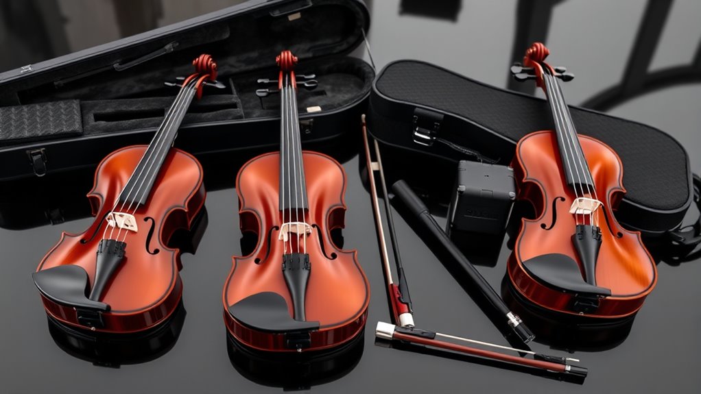 I recommend brands like Yamaha, Strunal, and Violectric for their durability and sound quality. Yamaha is renowned for consistent craftsmanship, offering reliable instruments that last. Strunal provides excellent build quality with warm tones, perfect for beginners progressing quickly. Violectric specializes in electric violins with superb sound and sturdy construction. Investing in these brands guarantees you get a durable, high-quality instrument that helps you develop your skills and enjoy playing.