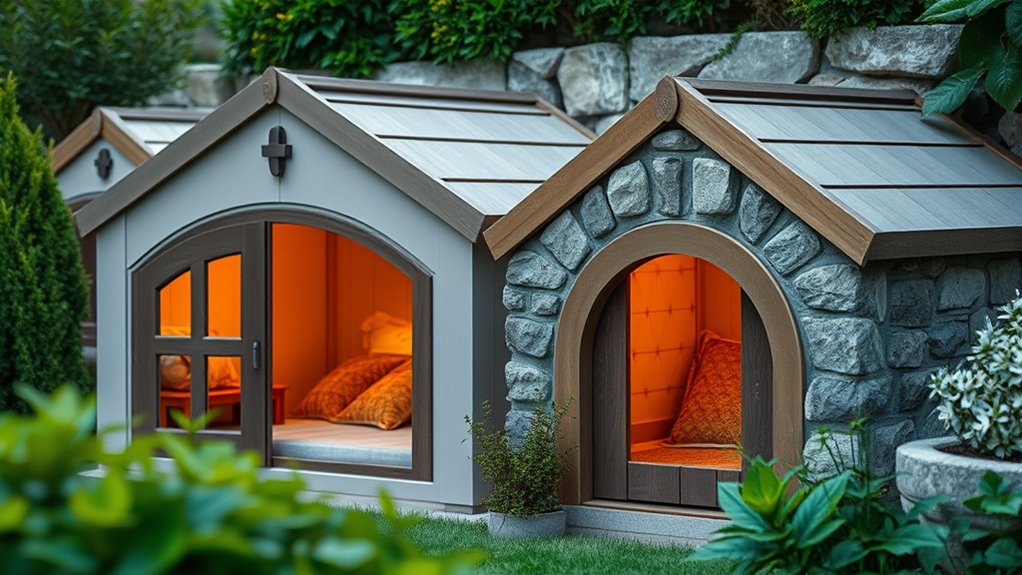 These premium heated outdoor pet houses are quite energy-efficient because they use insulated walls and energy-saving heating elements. I’ve noticed they warm up quickly without high power consumption, which helps keep utility bills low. Plus, many feature thermostats or timers, allowing me to control heat levels and conserve energy. Overall, they’re designed to keep my pets cozy while being mindful of energy use, making them a smart choice for outdoor warmth.
