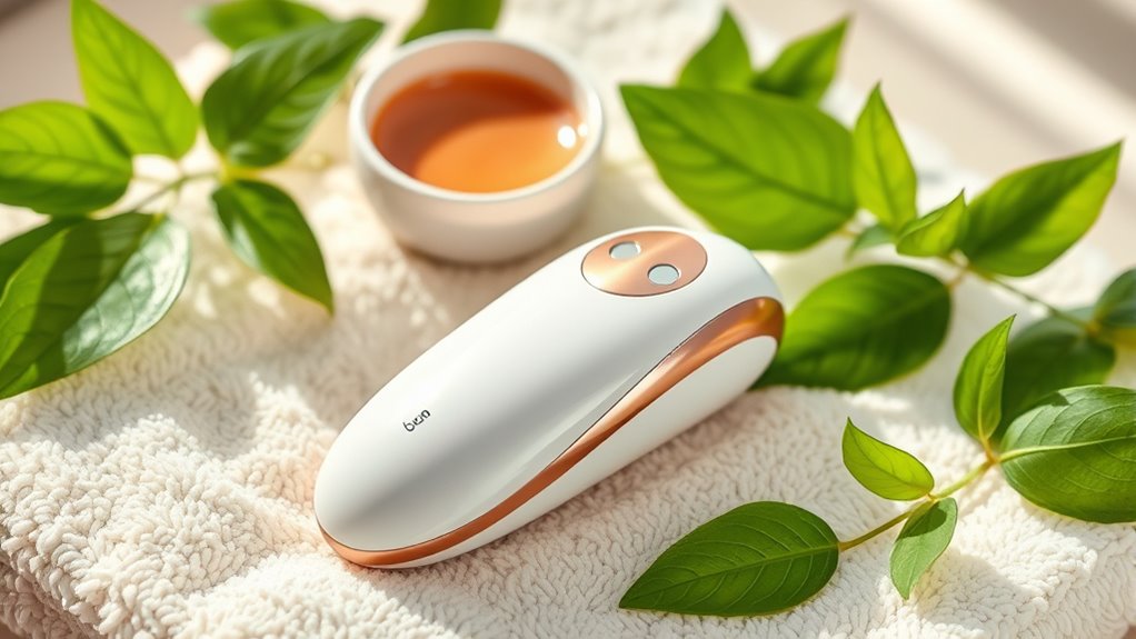 Opting for a microcurrent facial device that’s easy to use can make a significant difference in your skincare routine. Devices with intuitive controls, like single-button operation or clearly labeled modes, are perfect for beginners. Adjustable settings, such as multiple intensity levels, let you customize treatments without complexity. Clear instructions or tutorials help guarantee proper application, placement, and treatment duration, reducing guesswork. Ergonomic, lightweight designs make handling comfortable and maneuvering around facial contours effortless. Safety features like automatic shut-off, current monitoring, or zone alerts add peace of mind, preventing misuse and ensuring a stress-free experience. Overall, user-friendly features help you get consistent, effective results while making the process simple and enjoyable.