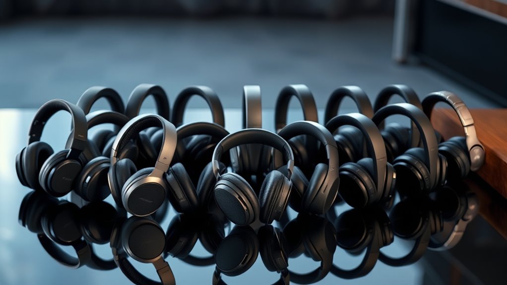 The build and durability of premium wireless noise-canceling headphones play a crucial role in how well they stand up to daily use and demanding environments. I look for models crafted with reinforced plastics, metal sliders, and high-quality leather or memory foam ear cushions, ensuring they can handle frequent handling. Comfort during long wear is closely tied to their build, with features like pressure-relieving headbands and soft ear pads making extended sessions more bearable. Foldable designs with sturdy hinges and protective cases boost portability, while resistance to sweat, dust, and moisture extends their lifespan. Ultimately, durability depends on internal component quality, resistance to wear, and the ability to sustain sound and noise-canceling performance over time.