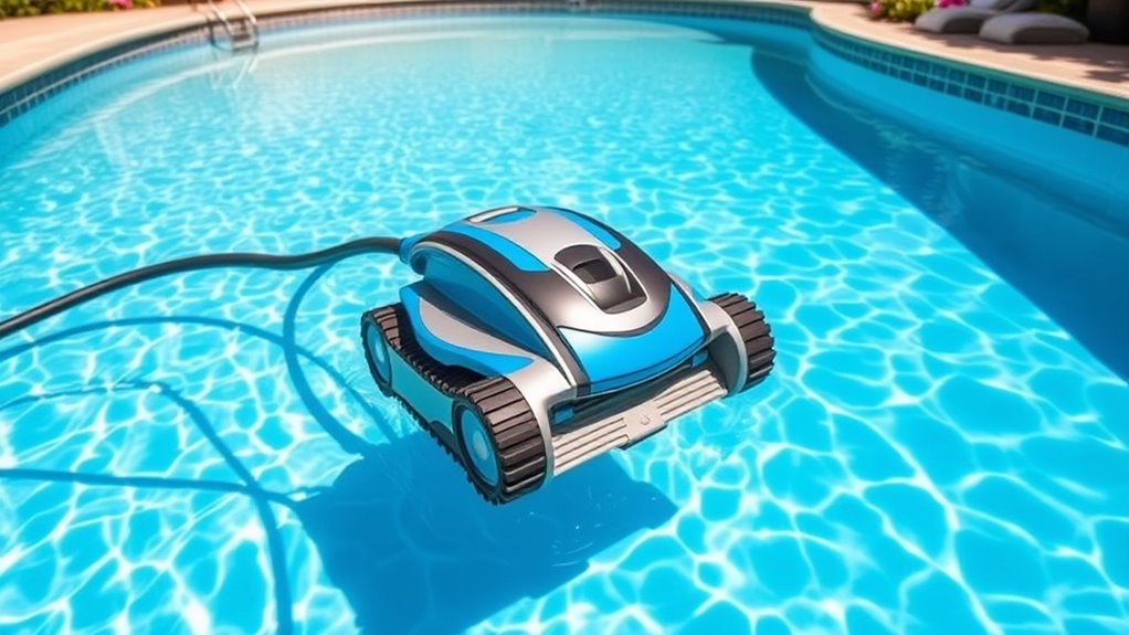 Maintaining pressure-side pool cleaners is essential for ensuring they perform reliably and last longer. Regularly replacing debris bags and inspecting hoses prevents clogs and mechanical failures, extending the cleaner’s lifespan. Durable construction materials, like high-quality plastics and reinforced hoses, resist damage from pool chemicals and sunlight, ensuring longevity. Proper maintenance routines, including cleaning filters and checking wheels and connectors for wear, help maintain consistent cleaning performance. Mechanical parts such as drive wheels, belts, and tail scrubbers can wear out over time, so periodic replacements are necessary. Choosing models with easily available replacement parts and strong manufacturer support minimizes downtime and repair costs. Overall, diligent maintenance and quality materials are key to maximizing your pressure-side cleaner’s durability and effectiveness.