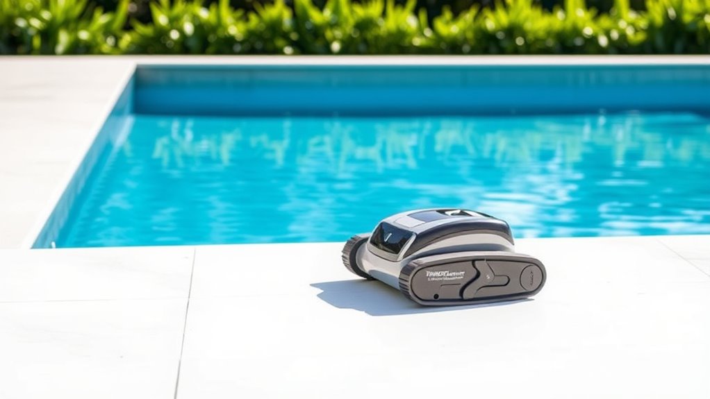 Ensuring your pool cleaner is compatible with your pool’s size is essential for effective and quiet operation. I always check that the cleaner is rated for my pool’s dimensions—up to 50 feet for larger pools or around 20 feet for smaller above-ground setups. It’s important to verify that the hose length and flexibility can cover the entire surface without constant repositioning. I also consider the suction power and movement range to handle deep ends and irregular shapes efficiently. Additionally, I make sure the cleaner matches my pool’s surface type, whether gunite, vinyl, or fiberglass, to optimize cleaning performance. Finally, I look at the navigation system and cycle duration to ensure thorough coverage within a reasonable timeframe. Compatibility with your pool’s size is key to a quiet, effective clean.