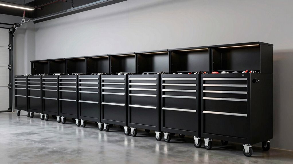 Organizational accessories are essential for making the most of deep drawers in a rolling tool chest. Drawer dividers and liners help maximize space and keep tools neatly separated, preventing clutter. Adjustable or removable dividers allow me to customize compartments for different tool sizes and types, making organization flexible. Drawer liners prevent tools from sliding during movement and protect delicate surfaces from scratches and damage. Hanging hooks and small trays can be added to utilize vertical space and improve access to frequently used items. Label-ready drawer fronts and modular accessories make it easy to quickly identify tools and small parts, saving time. These accessories ensure my tools stay organized, accessible, and protected, ultimately boosting my efficiency and workflow.