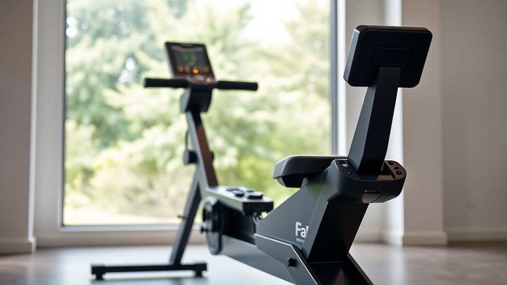 Space is often a limiting factor in home gyms, so selecting a rowing machine with a space-saving design becomes essential. Many models feature foldable frames or vertical storage options, allowing you to minimize their footprint when not in use. Compact dimensions, often under 70 inches long, help these machines fit easily into small apartments or corner spaces. Foldable or collapsible designs enable you to store the equipment upright, reducing space by up to 70%. Lightweight construction and built-in transportation wheels make moving and storing the machine simple. Choosing a model with a small footprint and foldable features guarantees you maximize your available space without sacrificing workout quality. These space-efficient designs make full-body workouts accessible even in tight quarters.