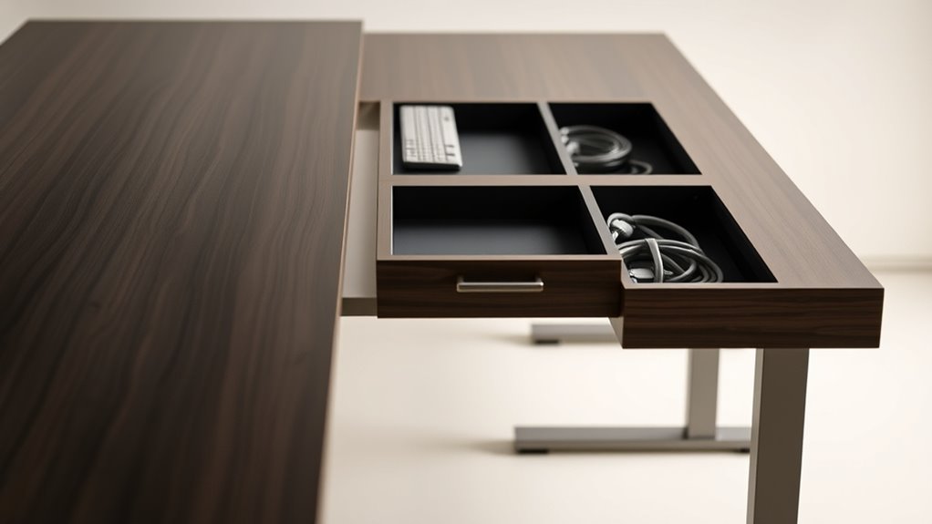 Effective cable management drawers are essential for maintaining a clean and organized workspace, especially with a sit-stand desk that frequently changes height. They often feature built-in channels or clips that neatly organize and hide cords, preventing clutter. Many desks include cable grommets or cut-outs, making it easy to route wires through the desktop for a tidy look. Adjustable or removable dividers in the drawers let you customize storage based on your device needs. Durable clips and hooks help secure cables, reducing tangling during height adjustments. Good cable management drawers support multiple devices, minimizing wear and tear on cords. When choosing a desk, look for these features to keep your workspace tidy, safe, and efficient—making your sit-stand setup more functional and less messy.
