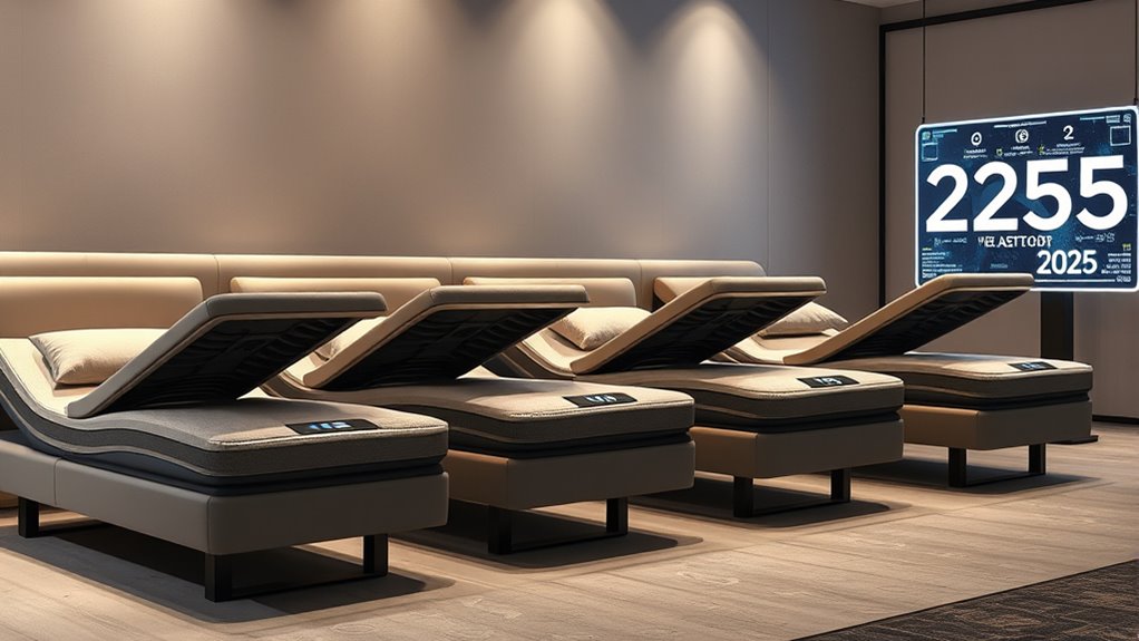 If you’re looking for the top smart adjustable beds with lumbar support in 2025, I’ve found some excellent options that blend comfort and technology seamlessly. These beds offer customizable positions, massage features, USB ports, and durable construction, all while providing targeted lumbar support to reduce back pain and improve posture. Whether you prefer a plush or firm feel, there’s a perfect match waiting. Keep exploring further to find out which one suits your needs best.