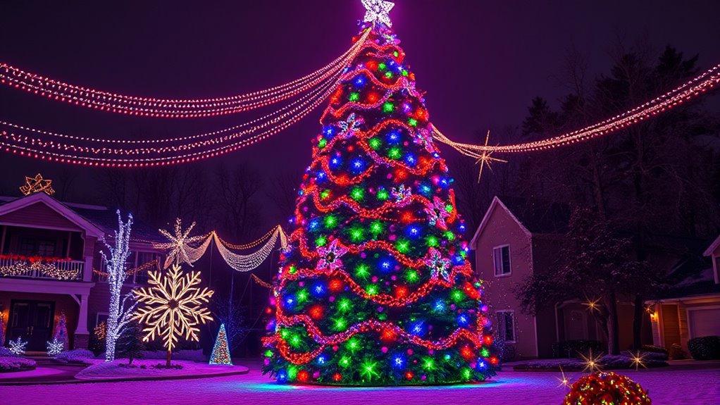 Lighting customization options are key to creating a festive display that truly reflects your style. Many smart Christmas lights offer a variety of modes, like static, flashing, fading, and music-synchronized effects, so you can craft the perfect atmosphere. Advanced features let you select and save specific colors or create dynamic, color-changing sequences—some lights support over 16 million colors, making endless possibilities available. Scene presets for different occasions allow quick switching between themes like festive, romantic, or party vibes. Dimmable options give you control over brightness, perfect for setting the right mood. Additionally, grouping multiple light strings enables synchronized control, while timers and schedules add convenience, helping you automate and enhance your holiday display with ease.