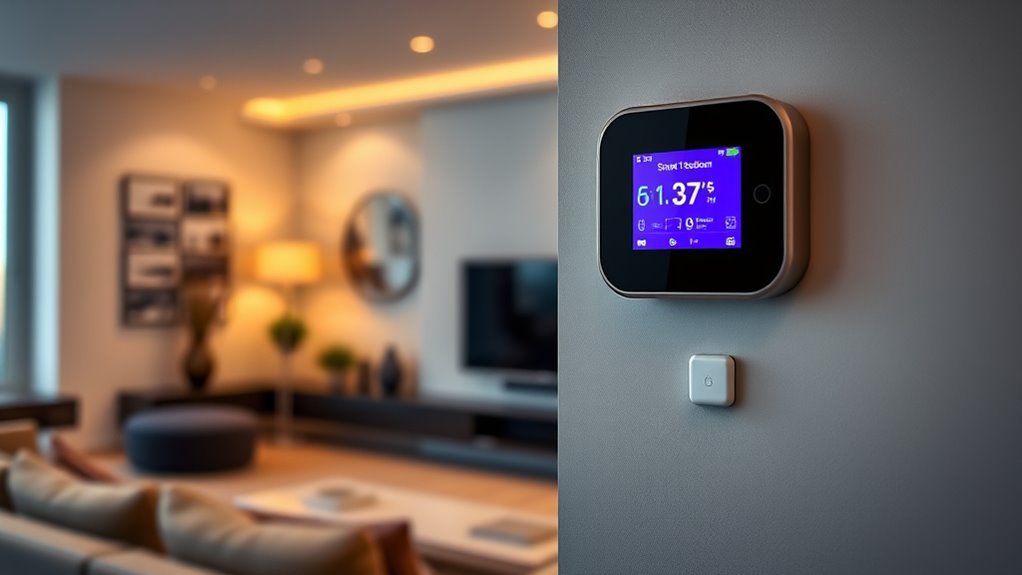 The sensor range and placement play a critical role in ensuring your smart thermostat functions accurately and efficiently. Typically, indoor sensors have a range of up to 200 feet, giving you flexibility to place them in various rooms for precise temperature monitoring. Proper placement is essential—install sensors in occupied rooms, away from direct sunlight, drafts, or heat sources, to get reliable readings. Some sensors use Wi-Fi for direct control, while others rely on RF links to connect with the main thermostat. Multiple sensors can monitor different zones, offering granular control and enhancing overall comfort. Keep in mind, both the range and placement directly affect the system’s ability to detect occupancy and maintain consistent temperatures throughout your home.