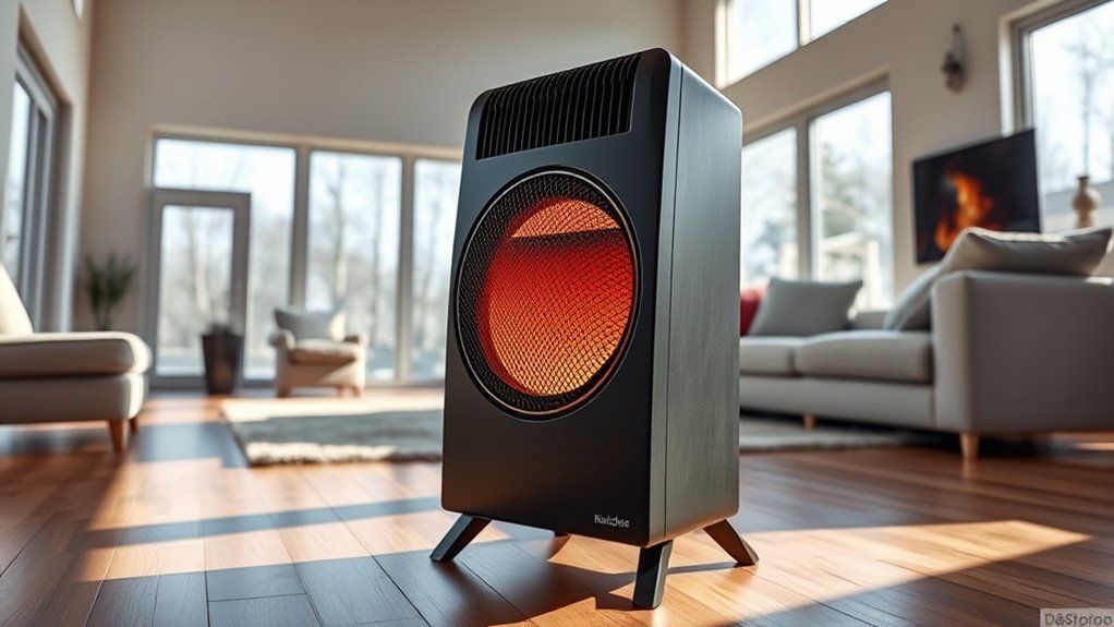 Choosing the right space heater for large rooms of 500 square feet or more requires careful attention to heating capacity. I recommend selecting models with at least 1500W of power to guarantee adequate warmth. Heaters with high BTU ratings, such as 5200 BTU or above, can quickly and effectively heat sizable areas. It’s also beneficial to look for units with wide oscillation, around 70° or more, to distribute heat evenly across the entire space. Infrared and convection heaters are often the best choices for large rooms because they provide consistent, whole-room warmth. Most importantly, match the heater’s coverage area to your room size. An undersized heater will struggle to keep the space warm, defeating the purpose of a large-room heater.