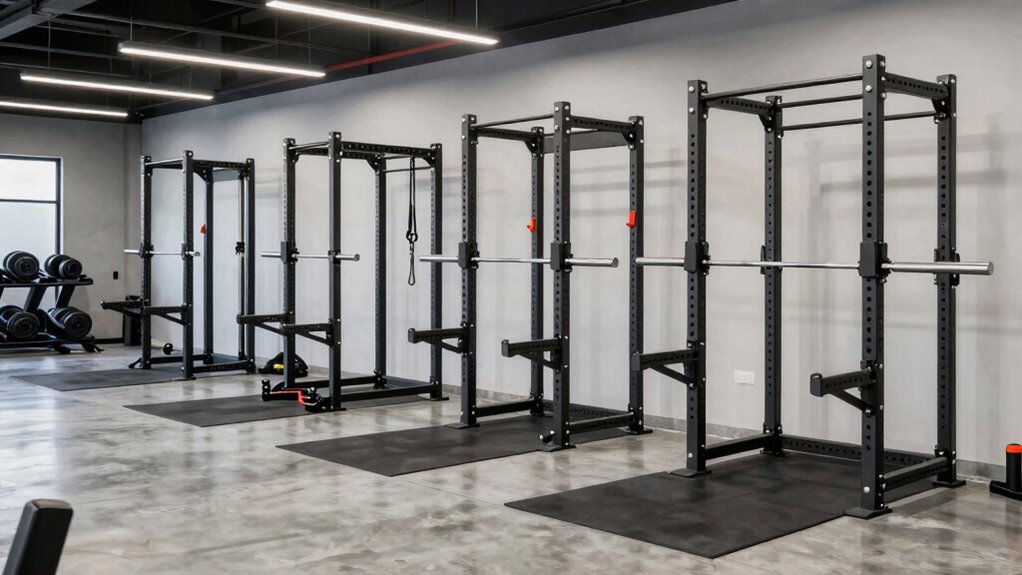 You’ll want at least 4 feet of width for a basic squat rack, but if you’re dreaming of a full power cage, plan for a massive 6 to 8 feet—because your gains deserve room to grow! Depth varies too; a standard rack needs about 4 feet front-to-back. Trust me, giving your gym space to breathe makes all the difference between cramped chaos and a workout sanctuary.