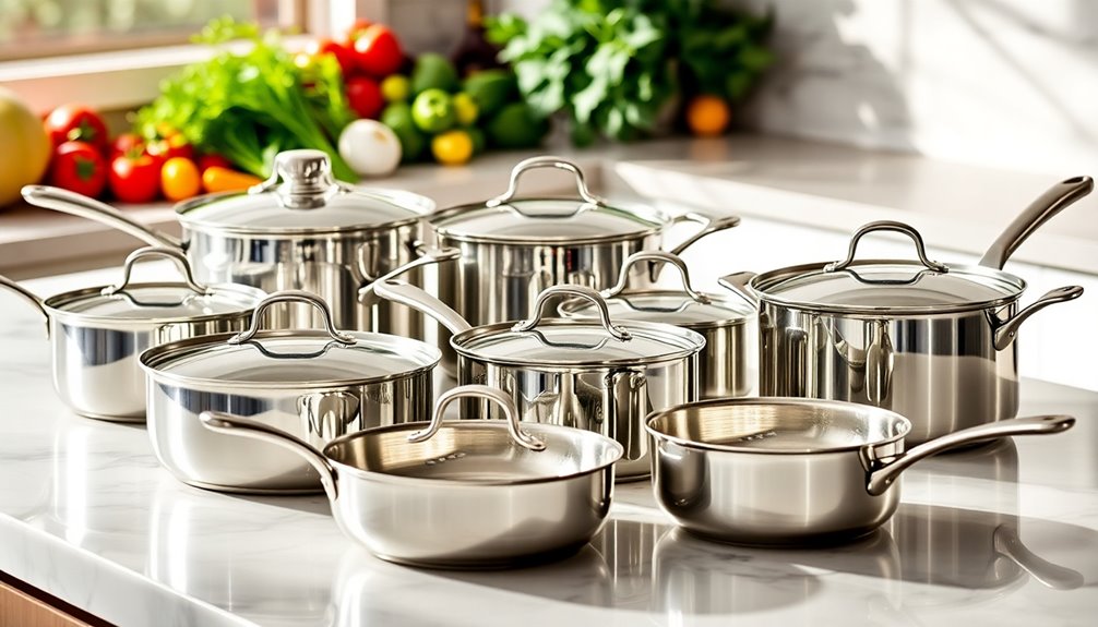 As a home chef, I've discovered some fantastic stainless steel cookware sets for 2025. From the durable Amazon Basics Induction-Ready 11-Piece Set to Cuisinart's sleek Chefs Classic Collection, there are options for every cooking style. I love the Tramontina Tri-Ply Set and the Ninja EverClad for their heat distribution and ease of use. Trust me, finding the right cookware makes a difference, and there's so much more to explore about these top picks!