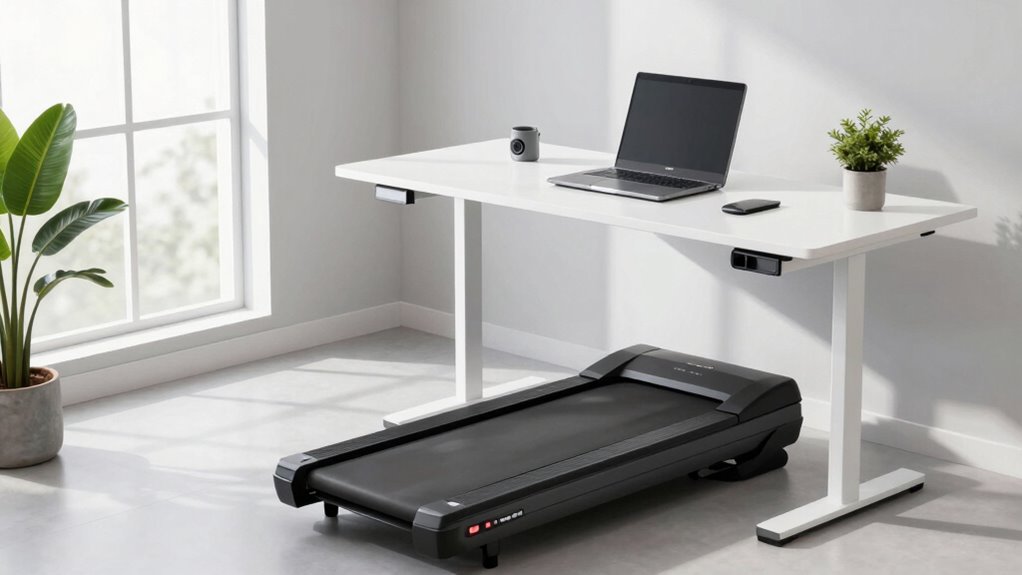 Since motor noise can considerably impact your work or home environment, paying attention to noise levels is essential when selecting a standing desk treadmill. Ideally, look for models producing less than 45 dB, ensuring a quiet experience. Brushless motors tend to operate more quietly than traditional brushed motors, reducing disruption during use. Keep in mind that higher horsepower (HP) motors may generate more noise, but many well-designed models incorporate sound-dampening features to minimize this. Speed also influences noise levels; faster speeds typically produce more sound, so selecting a treadmill with sound insulation is beneficial. Additional sound reduction can come from rubber shock absorbers and vibration isolation mats, which help contain noise and vibration, creating a more peaceful workspace.