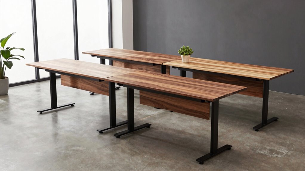 Choosing a standing desk with a solid wood top means prioritizing material quality and durability to guarantee long-lasting performance. High-quality solid wood, like rubberwood, acacia, or walnut, offers exceptional strength and resilience. Sealed with UV finishes and seamless finger joints, these surfaces resist warping, scratches, and stains, even with daily use. Their natural density and grain help prevent cracks and maintain stability over time. Plus, a durable solid wood top can support heavy equipment, often exceeding 176 pounds, making it suitable for demanding workspaces. Opting for FSC-certified or sustainably sourced wood not only ensures environmental responsibility but also guarantees the material’s quality. Overall, solid wood tops built with these standards provide the longevity and robustness necessary for a reliable standing desk.