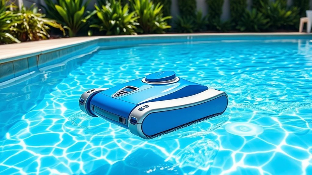 Imagine a robot swimming effortlessly across your pool, avoiding obstacles and covering every inch. That’s what smart navigation features do—they guide the cleaner precisely, preventing missed spots and saving time. I’ve seen these tech-savvy cleaners navigate complex pool shapes with ease, making cleaning more efficient. They learn and adapt, ensuring your pool stays spotless without you lifting a finger. It’s like having a personal pool assistant working nonstop.