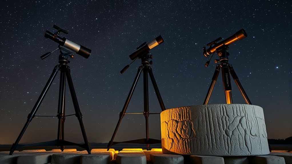 When setting up my astrophotography gear, I prioritize mounts and tripods that are quick and easy to assemble. I look for models with simple mechanisms like twist locks or tool-free adjustments, which save time in the field. Clear, step-by-step instructions or intuitive designs help me set up and align my equipment rapidly. Lightweight and portable options are ideal, as they’re easier to carry and don’t require complex procedures. Features like built-in polar scopes or Wi-Fi control streamline the alignment and targeting process, making setup smoother. Additionally, I make certain that components such as pier mounts or tripod legs can be securely fixed without fuss, reducing the time spent on adjustments. Overall, ease of setup is vital for maximizing my time capturing stunning night sky shots.
