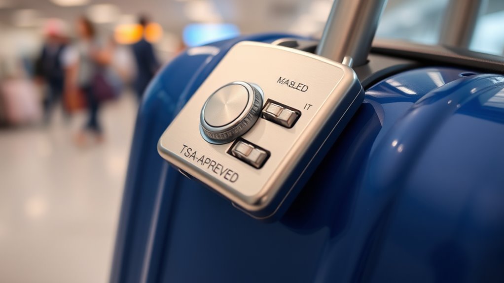 When considering TSA-approved luggage locks, it’s important to guarantee they meet the specific requirements of airport security. These locks should be designed to open and relock easily by TSA agents using a master key, avoiding damage to your luggage. Look for the TSA-approved symbol on the packaging or lock body, which indicates compliance with regulations. Some locks also feature inspection indicators, like a pop-up red button, that notify you if your bag has been accessed. Remember, not all TSA-compatible locks are accepted everywhere; it’s essential to verify their official TSA approval to ensure they work at various airports globally. This compatibility ensures smooth security checks, reduces the risk of damage, and keeps your luggage secure during travel.