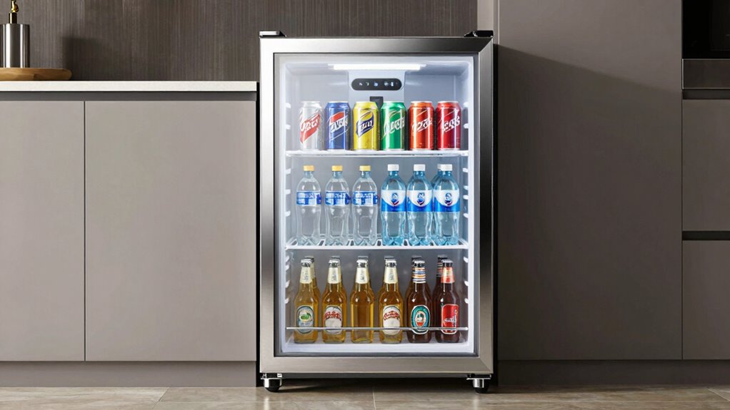 Security features are essential when selecting an under counter beverage fridge, especially if you want to prevent unauthorized access or tampering. A discreet lock, like a key-operated mechanism, offers simple yet effective protection. Reversible door hinges with secure locking options provide flexibility during installation while keeping the fridge locked. Tempered glass doors with UV protection add an extra layer of security by shielding beverages from theft and tampering, especially if they include locking options. Digital keypad or electronic locks allow for programmable access, making it easy to control who can open the fridge. Childproof locks or safety locks are also valuable, preventing accidental access by children. Prioritizing these features guarantees your beverages stay safe and secure while maintaining convenience.