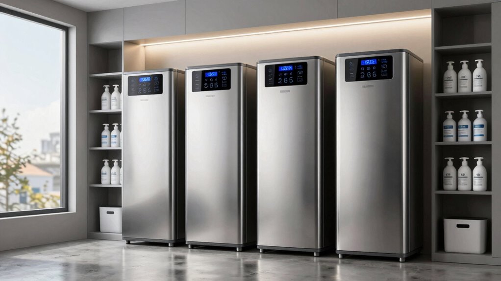 Maintenance varies by system type. Salt-based softeners need regular salt refills and periodic resin tank cleaning. Salt-free systems require less upkeep—mainly occasional filter replacements. Ion exchange units demand resin regeneration, usually automated or manually initiated. I recommend checking manufacturer instructions regularly, keeping an eye on salt levels, and scheduling professional inspections to guarantee peak performance and longevity of your water softener system.