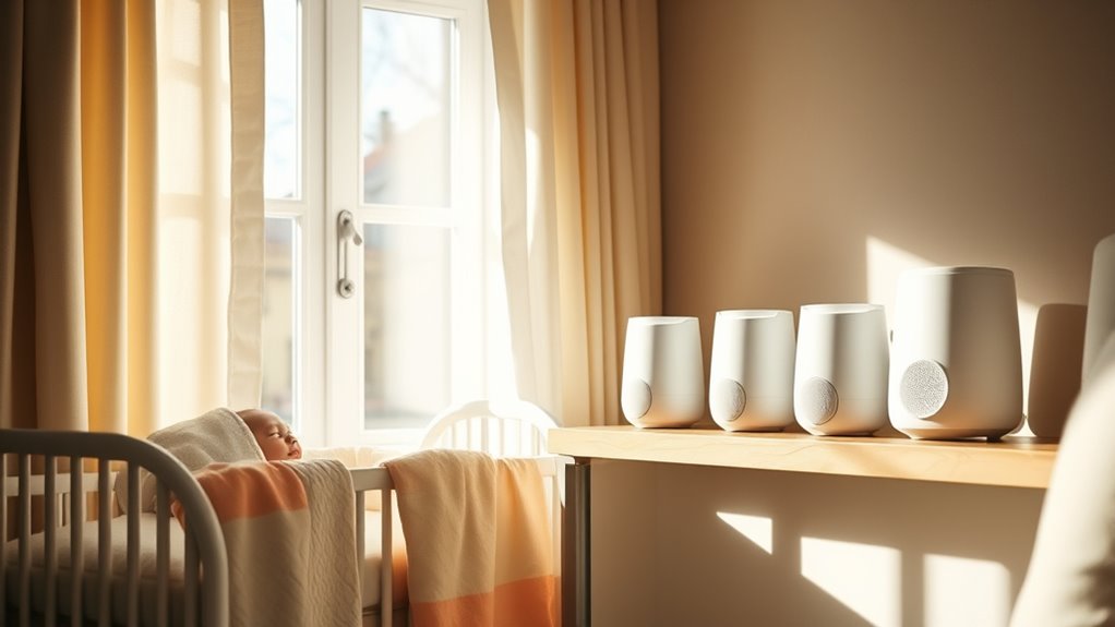 I’ve found five top white noise machines that really help soothe newborns and keep them comfortable. Options like the Dreamegg Portable Noise Machine and Babelio offer a variety of sounds, compact designs, and long battery life making them perfect for home and travel. Safety features and easy controls are key, along with adjustable volume and calming night lights. Keep going to discover detailed comparisons that will help you choose the best one for your baby’s needs.