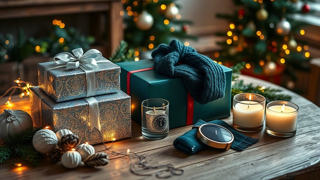 If you want to make your holidays extra special, I recommend choosing thoughtful gifts that match the recipient’s style and interests. Consider a premium leather duffle for travel lovers, high-tech gadgets like the Oura Ring or Ray-Ban smart glasses, or top headphones and earbuds for audiophiles. Practical gifts like a Vitamix blender or an ice cream maker can also delight the family. Keep budget and personalization in mind—more ideas that I’ll share to make your gift-giving unforgettable.